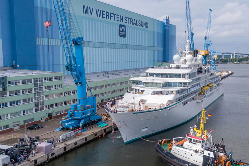 MV Werften’s most recent delivery, the Crystal Endeavor, the world’s largest luxury expedition yacht, took place from the Stralsund yard in June 2021 following a EUR 193 million government loan issued in October 2020 to help fund the remainder of the construction and shipyard operations through March 2021.